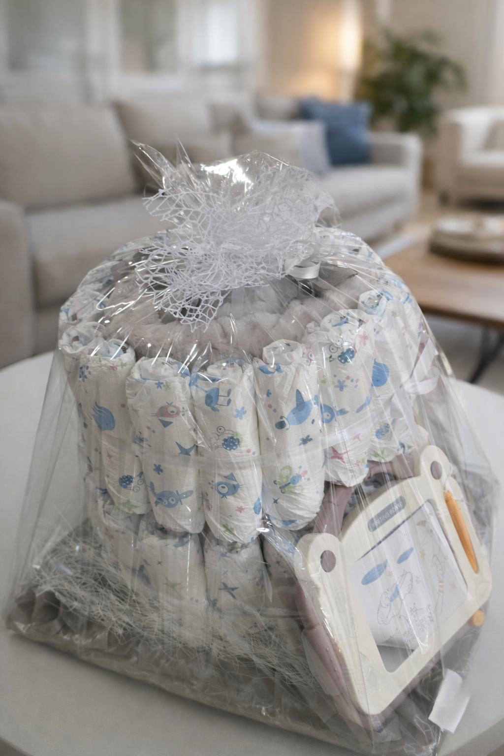 Ovaj prekrasni poklon paket dolazi u obliku torte od pelena, pažljivo je ručno aranžiran, dekoriran i potpuno spreman za darivanje.